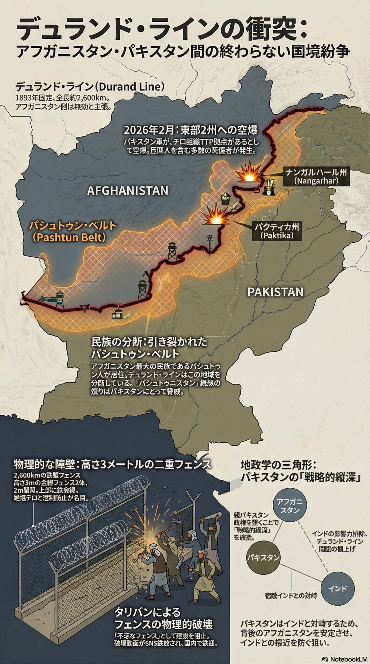 アフガニスタンとパキスタンの国境紛争は、単なる2国間の土地争いではありません。 それは、1893年の植民地時代の不条理な境界線(デュランド・ライン)が、現代の民族ナショナリズム、イスラム主義テロ、そして米・中・印・パの複雑な覇権争いと複雑に絡み合った結果です。