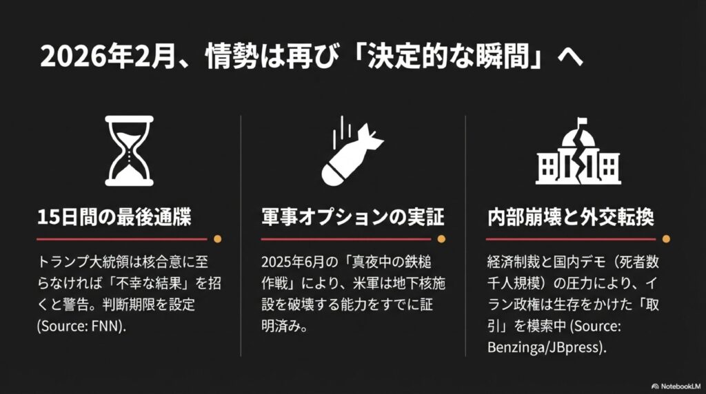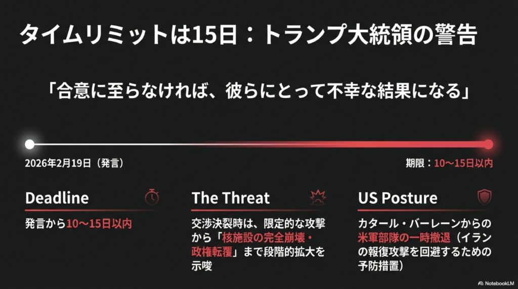 2026年2月19日、トランプ大統領はイランに対し、10日から最長15日以内に核開発に関する合意に至らなければ、「非常に悪い結果(限定的な軍事攻撃)」に直面すると警告を発しました。