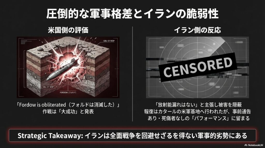 トランプ大統領は自身のSNSで「攻撃は非常に成功した」と述べ、「主要目標であるフォルドは消滅した」と主張しました。一方でイラン側は、施設は事前に避難済みであり、ウラン備蓄の大部分は安全な場所に保管されていたため、放射能汚染などの危険はないと報じました。