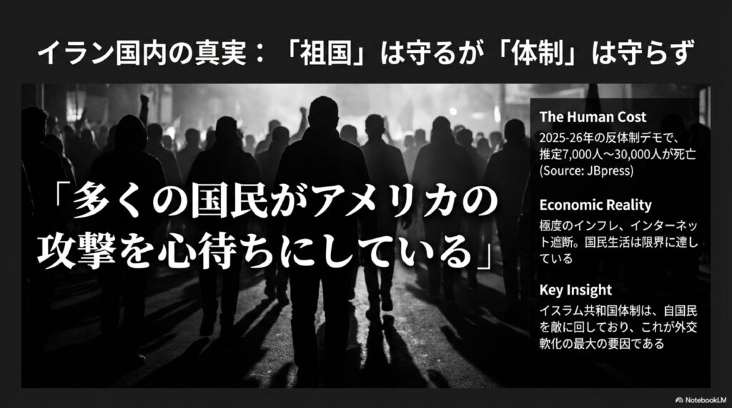 • 国民の本音: 長年現地を取材するジャーナリストによれば、多くの国民はもはや「体制」ではなく「祖国」を守りたいと考えており、皮肉にもアメリカによる攻撃が現状を打破することを期待する声さえ上がっていると伝えられています。