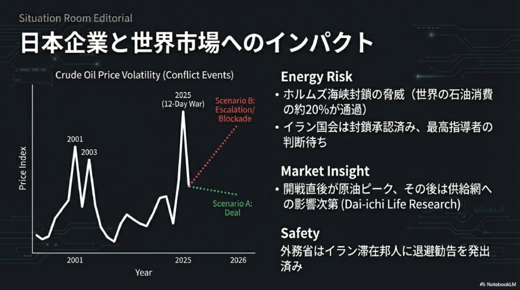 • 原油価格の高騰: 供給不安から価格が強力に押し上げられ、電気代や輸送コストの上昇、ひいては急激なインフレを招くリスクがあります。