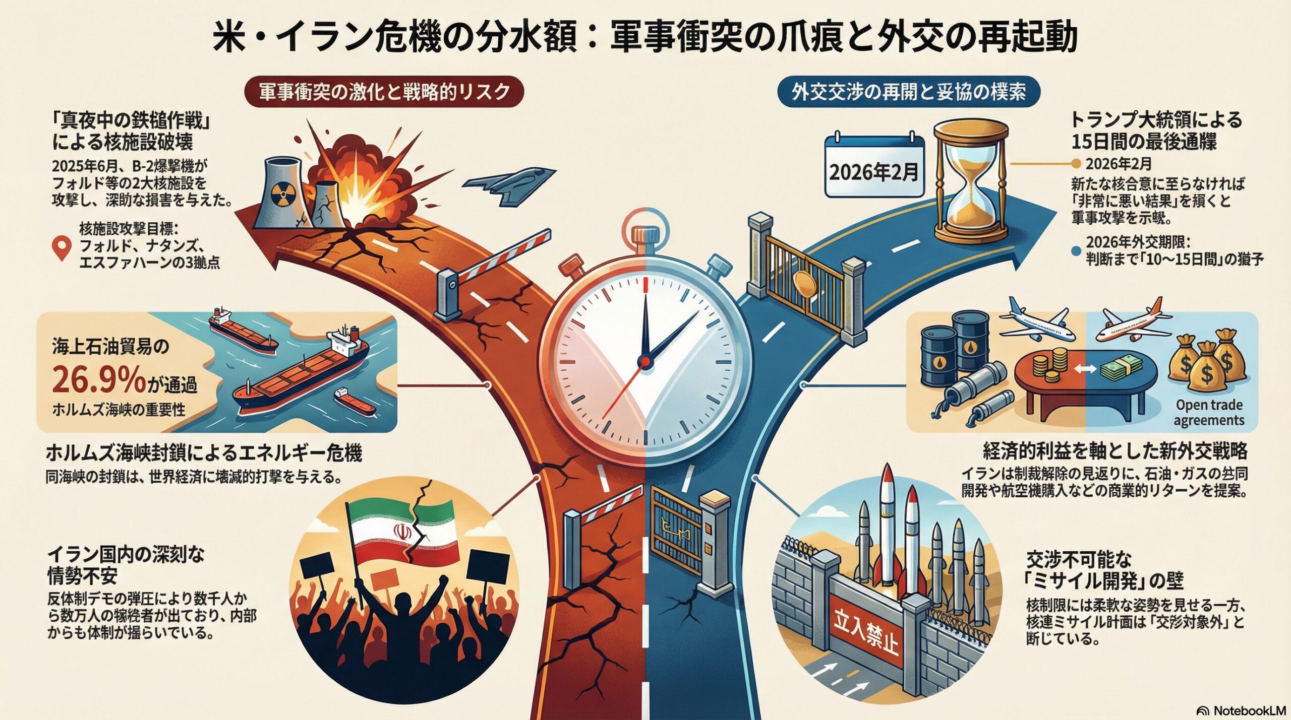 中東情勢は今、かつてない危機に直面しています。2025年6月に発生した「12日間戦争」と、アメリカ軍によるイラン核施設への直接攻撃、そして2026年初頭に突きつけられたトランプ大統領の最後通牒。これらの事態は、世界のエネルギー供給網や日本の経済安全保障を揺るがす重大な局面を迎えています。