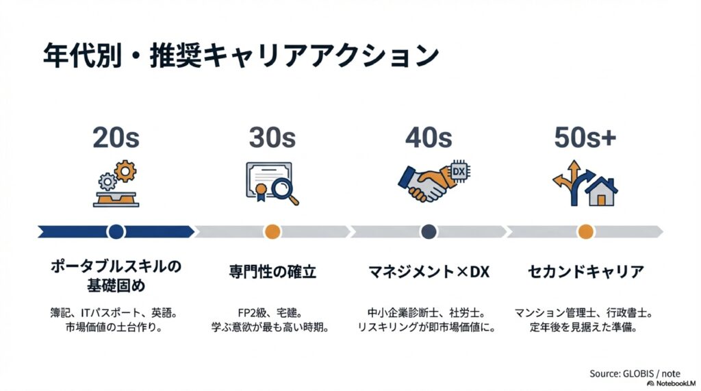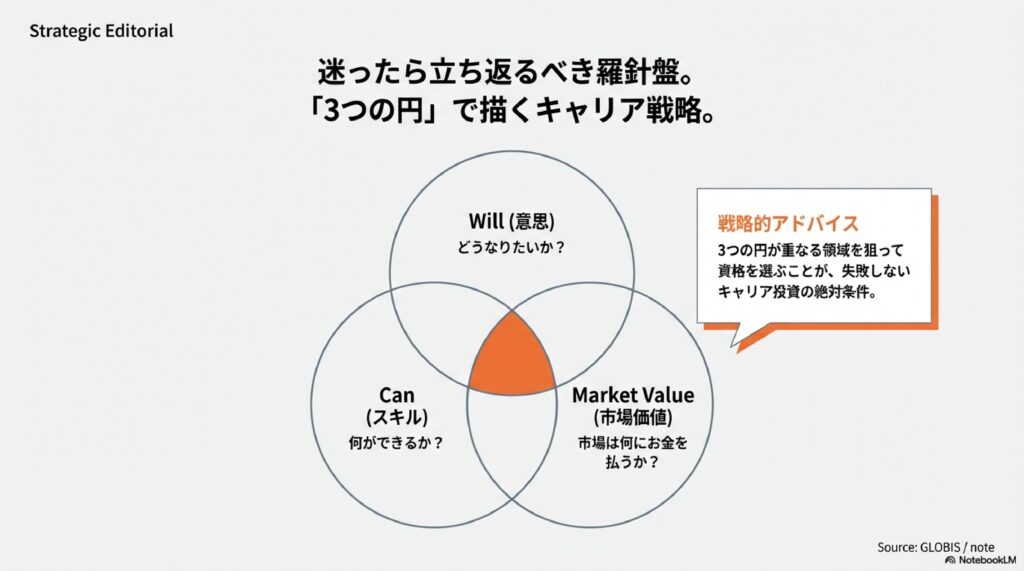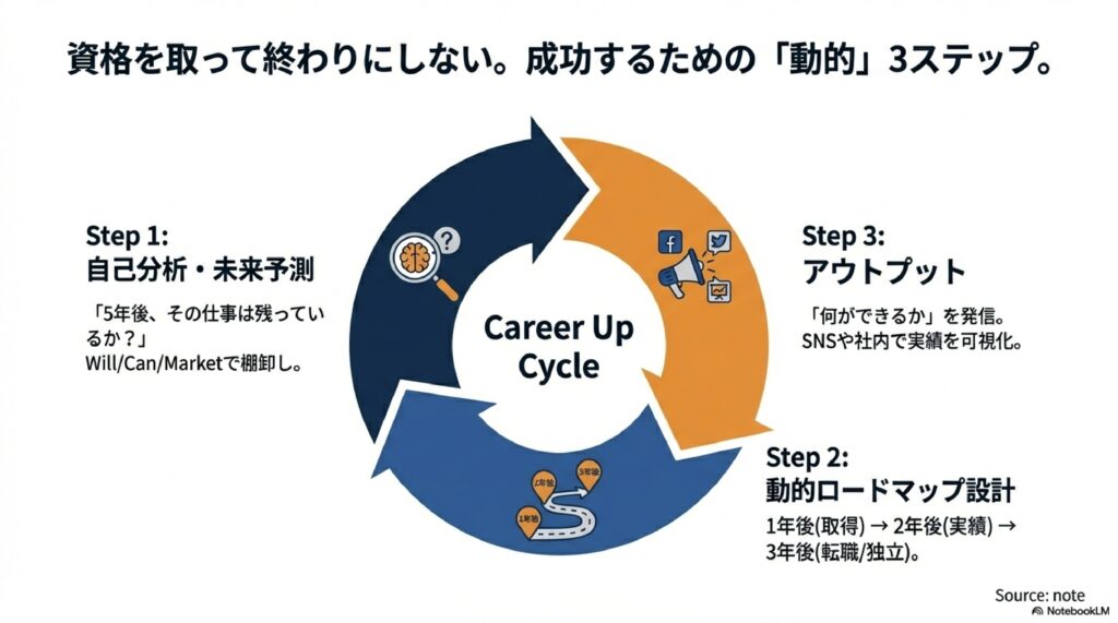 1. 自己分析と「未来予測」: 自分の「Will(意思)」「Can(スキル)」を棚卸しし、5年後その仕事がAIに代替されないか、市場価値(Market Value)があるかを分析する。