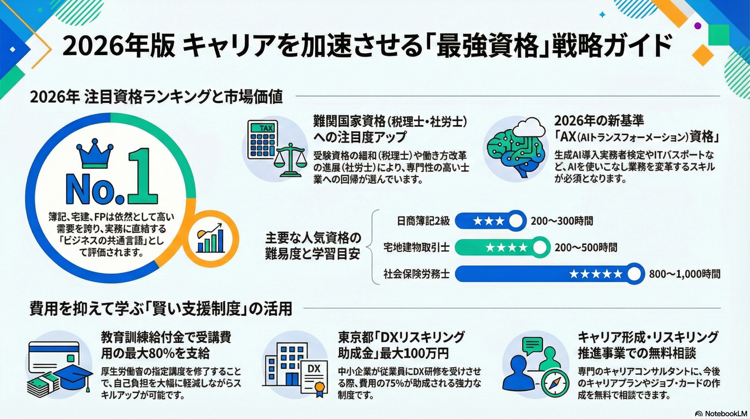 日商簿記やITパスポートといった「どこでも活かせる基礎力」を土台に、税理士や中小企業診断士などの「専門資格」を加えることで、希少性の高い「100人に1人」の人材になれるからです。
