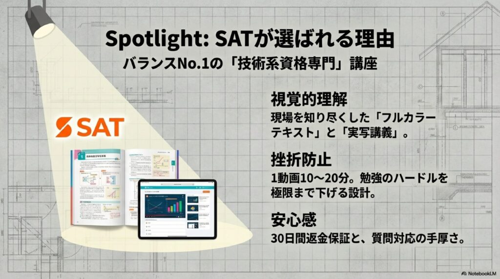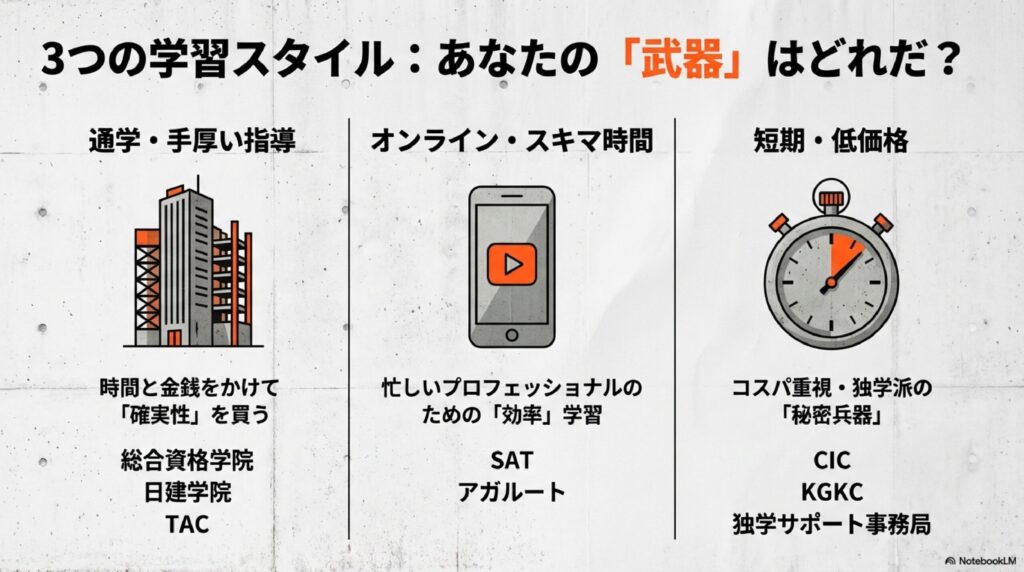 • メリット: 実際の施工映像やCGを駆使した映像講義は、現場未経験者でもイメージが掴みやすいと評判です。