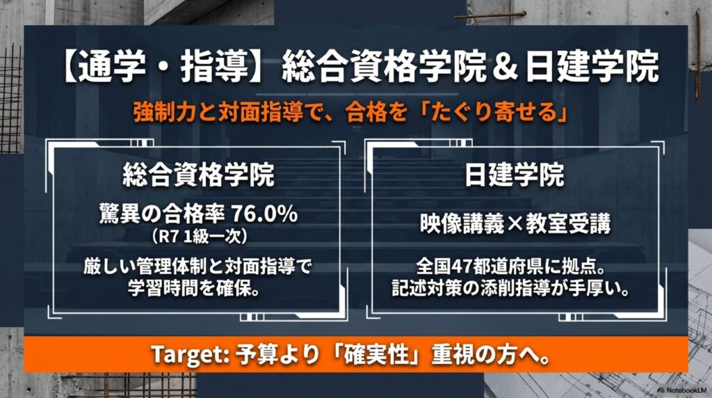 ◦ 通学: 一人ではサボってしまう人や、対面で直接指導を受けたい人向け。強制力が合格を引き寄せます。