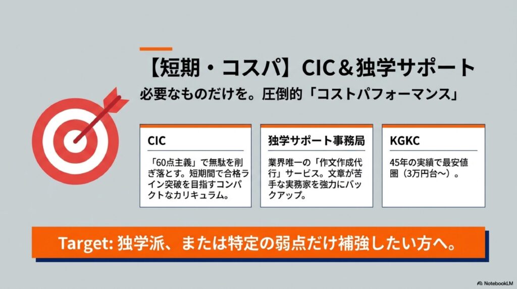 • 最短・最安で一次を突破したい → KGKC または CIC で要点を絞って学習。