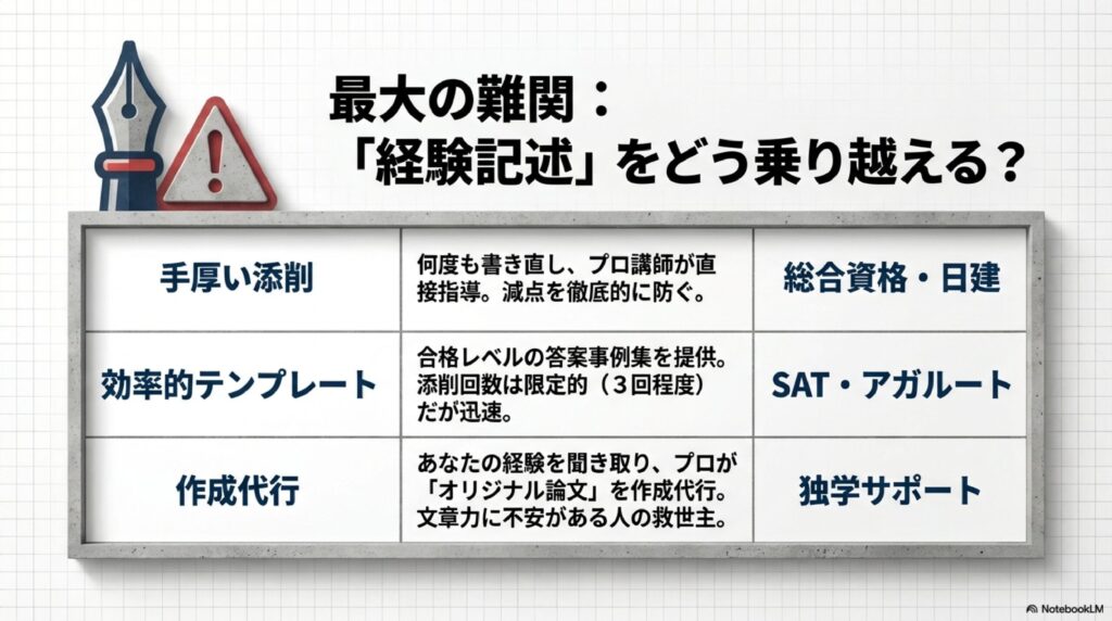 ◦ 最大難関の「経験記述」は、プロの添削が合否を分けます。添削回数や、作文が苦手な方向けの「作成代行サービス」の有無を確認しましょう。