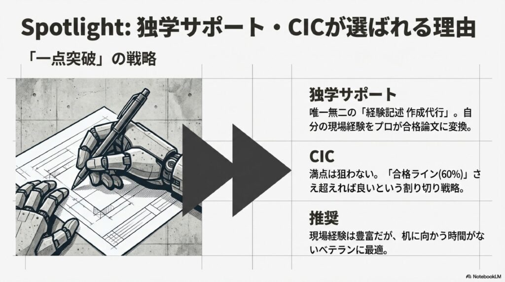 • メリット: 専門講師が受講者の実務経験を聞き取り、オリジナルの記述論文を代行作成してくれます。これにより、記述対策の時間を大幅に削減可能です。