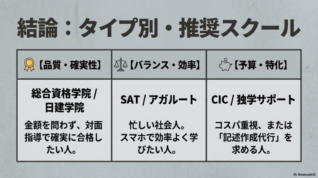 • 向いている人: 費用よりも「確実な合格」を最優先し、誰かに管理してもらいたい人。