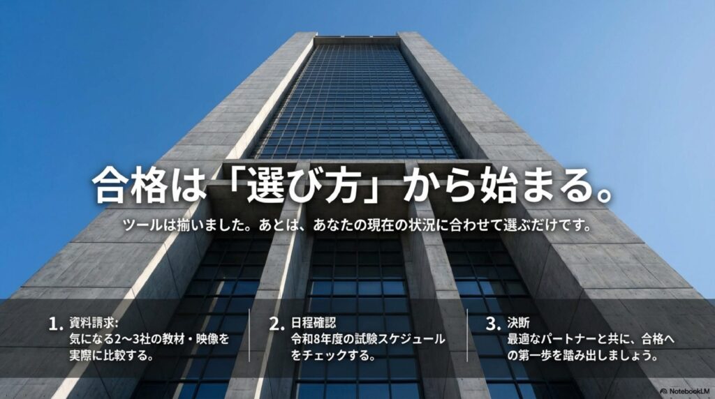 最後に どの講座を選んでも、最終的には自分の学習量が合否を決めます。しかし、自分に合った「武器(講座)」を選ぶことで、その努力は数倍の成果となって返ってきます。まずは無料の資料請求や体験動画で、自分との相性を確かめてみてください。それが合格への第一歩です。