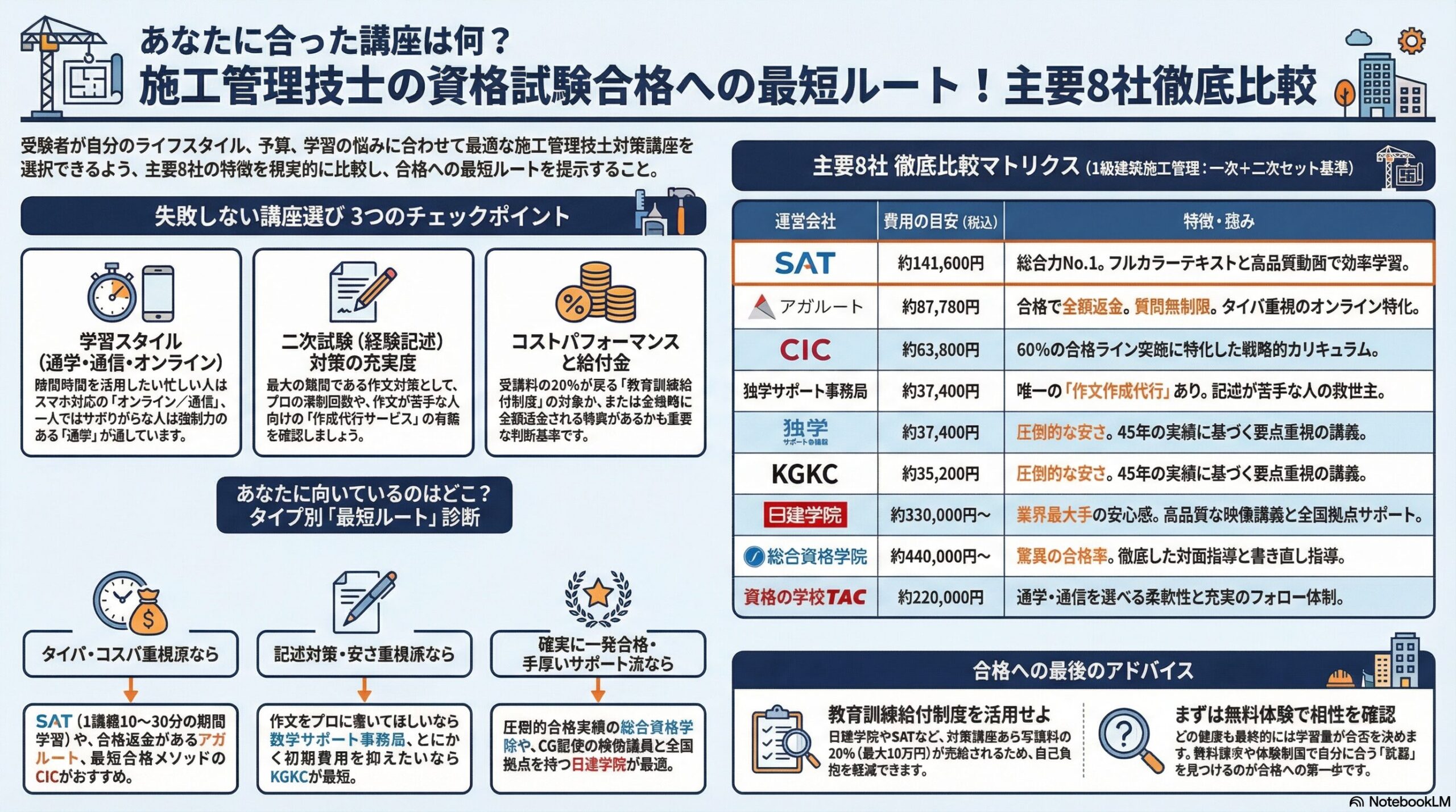 主要各社の特徴を、1級建築施工管理技士(一次+二次セット)を基準にまとめました。