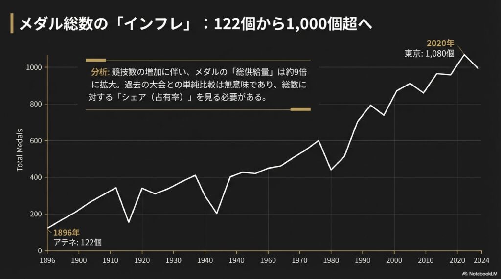 • 特筆すべき減少期: 唯一の例外は1932年のロサンゼルス大会です。この大会では、ヨーロッパからの遠隔地であったため参加国・選手数が激減し、一時的にメダル数が減少しました。