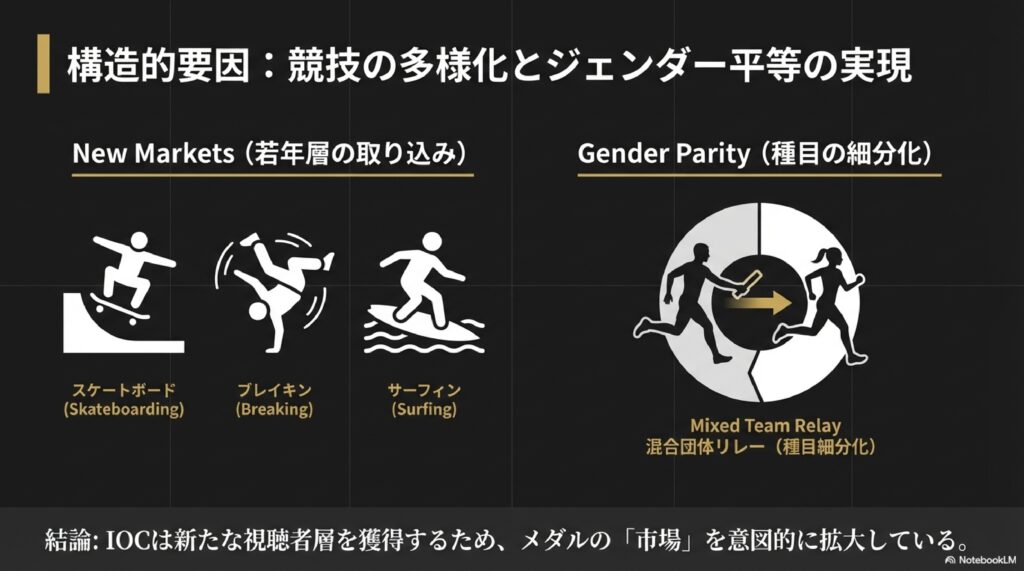 • 競技数と種目数の拡大により、メダル総数は今後も増加し続けるでしょう。