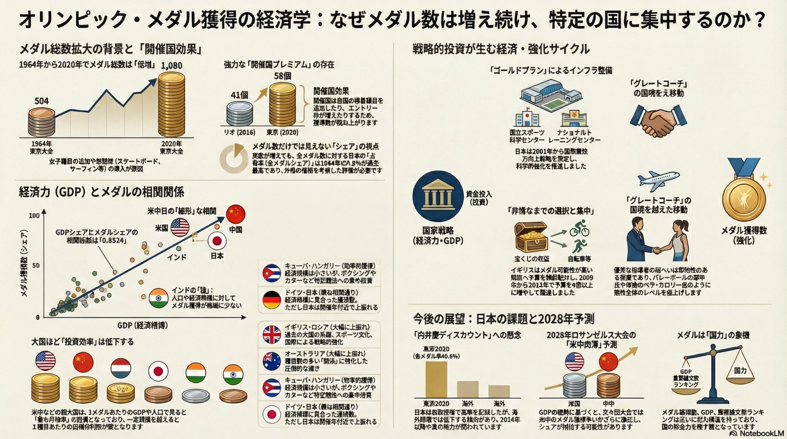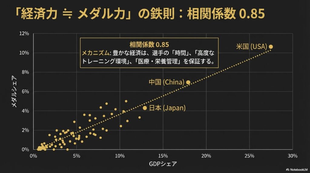 オリンピックのメダル獲得数は、個々のアスリートの資質以上に、その国の「経済力」と極めて強い相関関係にあります。