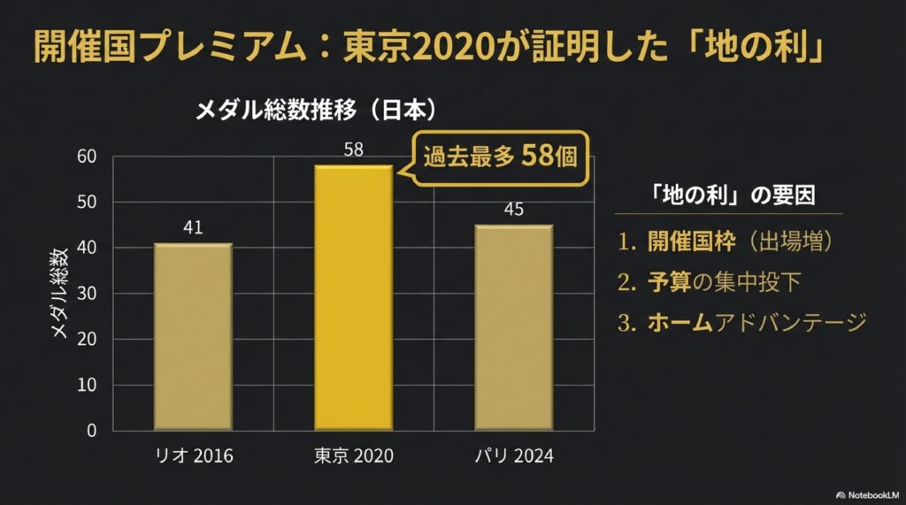 自国開催時にメダルが急増する要因として、以下の4点が挙げられます。