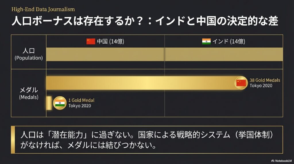 インドは人口で中国を追い抜き、経済規模も世界トップクラスでありながら、オリンピックのメダル獲得数は極めて少ない(2024年パリ大会で計6個、金0個)という特異な状況にあります。 資料はこの要因を「大いなる謎」としつつも、「総GDPだけでなく、1人あたりGDP(生活の余裕)がメダル獲得の物的基盤になる」という仮説を提示しています。つまり、国全体の経済規模が大きくても、個人の生活にスポーツを楽しむ余裕や、社会的なスポーツ文化が未成熟であれば、メダルには結びつかないのです。
