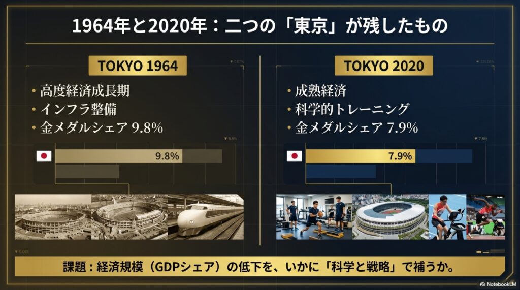 メダル数が増えているため、単に「獲得した個数」を過去と比較するだけでは、その国の真の実力を測ることはできません。資料によれば、1964年東京大会での日本のメダルシェア(総数に対する割合)は5.8%であり、これは実数が多かった2020年東京大会(シェア5.4%)や2024年パリ大会(シェア4.3%)を上回る実力であったことを示唆しています。「市場全体(メダル総数)が拡大している中で、どれだけのシェアを占めているか」という視点が、データの客観的な解釈には不可欠です。