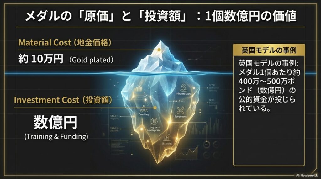 メダル獲得は、以下のサイクルを生み出します。 「メダル獲得」→「国民の理解・スポーツ文化の発展」→「政府・民間の投資拡大」→「競技環境のさらなる充実」→「さらなるメダル獲得」。 この循環が確立されると、国家としてのスポーツ産業や健康増進、さらには関連技術の発展へと繋がります。