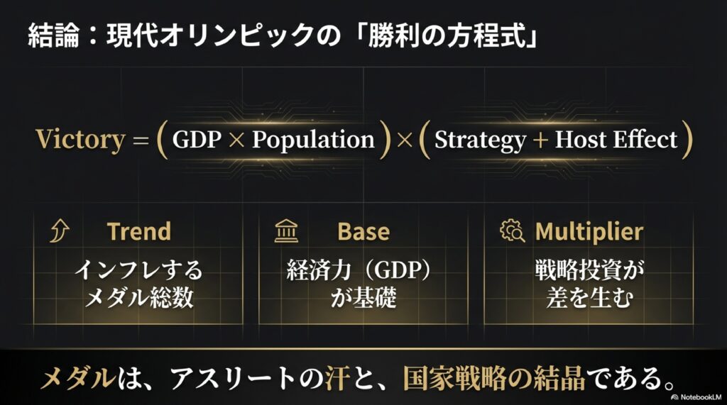 「平和の祭典」という崇高な理念の一方で、オリンピックは紛れもなく国家間の経済力と戦略がぶつかり合う戦場でもあります。私たちがメダル数に一喜一憂するのは、それが自国の「国力」や「戦略の正しさ」を証明する、最もわかりやすい鏡であるからに他なりません。