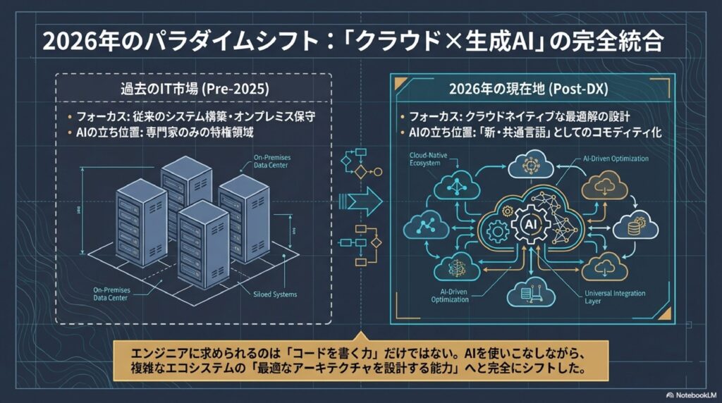 2026年のIT市場は、従来のシステム構築から「クラウド×生成AI」の完全統合へとシフトしています。かつては専門家のみの領域だったAI知識は「新・共通言語」としてコモディティ化し、エンジニアにはAIを使いこなしながら最適なアーキテクチャを設計する能力が求められています。