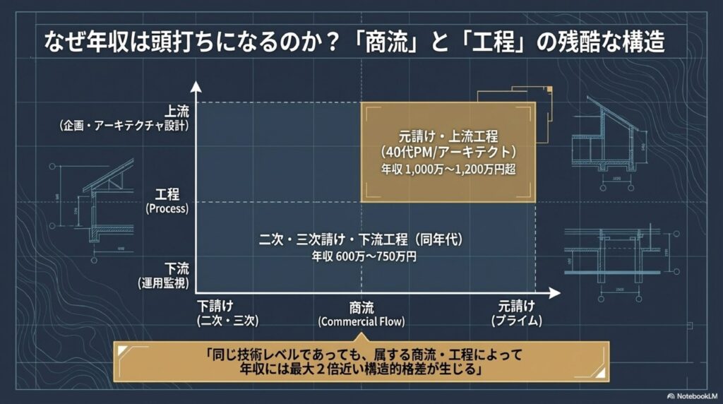 調査によれば、同じ技術レベルであっても、属する商流によって年収には最大2倍近い差が生じます。