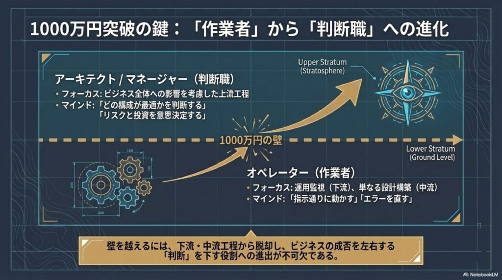 年収1000万円突破には、運用監視(下流工程)や単なる設計構築(中流工程)から脱却し、ビジネス全体に影響を与える「判断」を行う役割(上流工程・判断職)への進出が不可欠です。