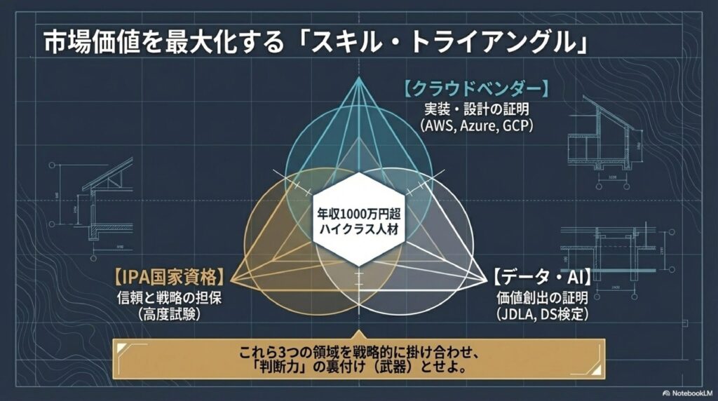 AWSだけでなく、大企業の採用が進むMicrosoft Azureや、データ分析・AIに強い**Google Cloud (GCP)**の資格を組み合わせる「マルチクラウド」の知識は、上位商流のアーキテクトとしての差別化要因になります。