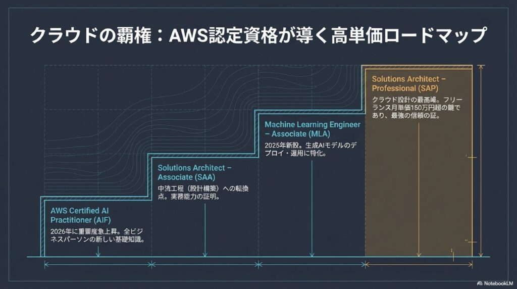 • Solutions Architect – Professional (SAP): クラウド設計の最高峰。これを保持していることは、大手企業の基幹システム移行案件において最強の信頼の証となり、フリーランスでは月単価150万円超を狙える鍵となります。