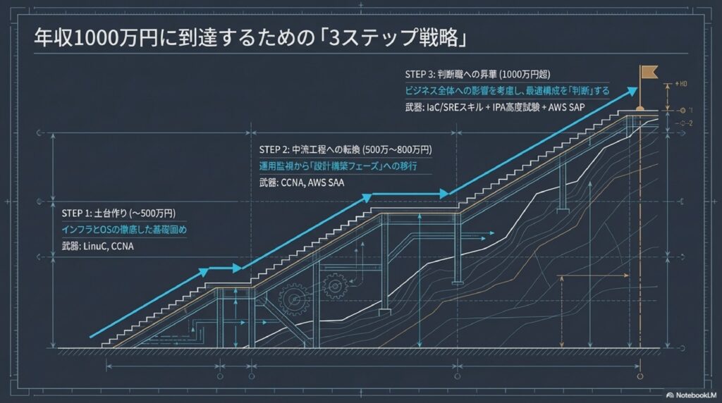 IaC(Infrastructure as Code)、コンテナ、SREといった希少スキルの習得に加え、IPA高度試験やAWS SAPを取得します。単なる技術作業者ではなく、ビジネス全体の影響を考慮して「どの構成が最適か」を判断する役割を担うことで、年収1000万円超の領域が見えてきます。