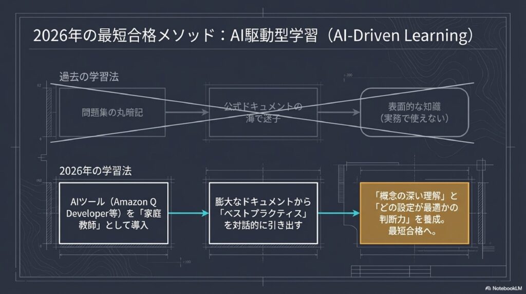 2026年の資格取得対策は、問題集の丸暗記から「AIとの対話を通じた概念理解」へと変貌しています。Amazon Q DeveloperなどのAIツールを「家庭教師」として活用し、膨大な公式ドキュメントからベストプラクティスを対話的に引き出す学習法が最短合格の鍵です。