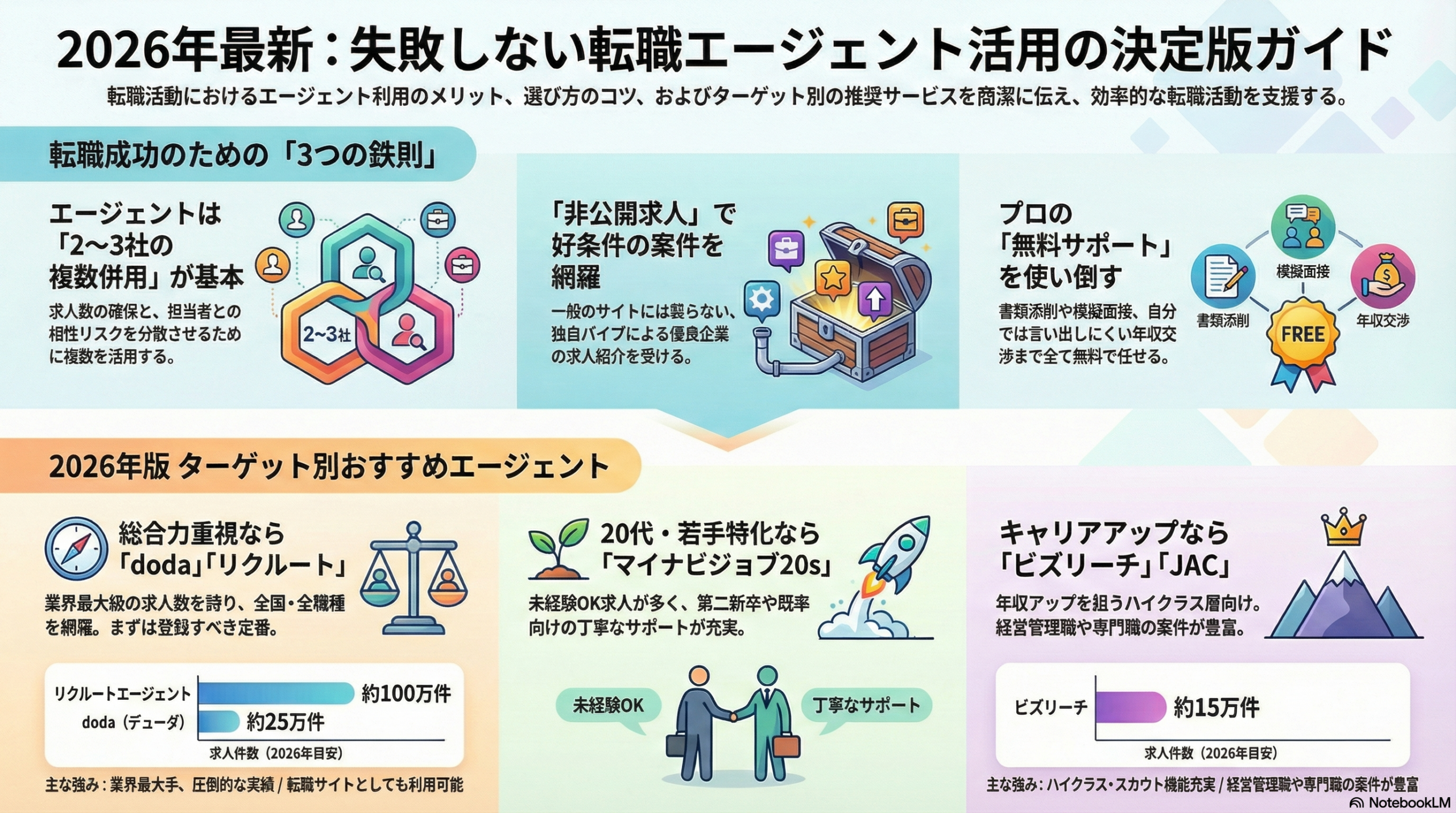 効率的な転職には、エージェントの活用が不可欠です。1社に絞らず、複数のタイプを併用するのが「死角なし」の戦略です。