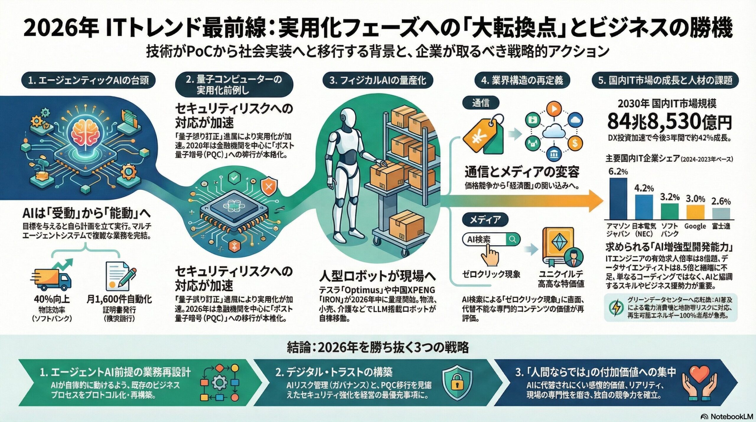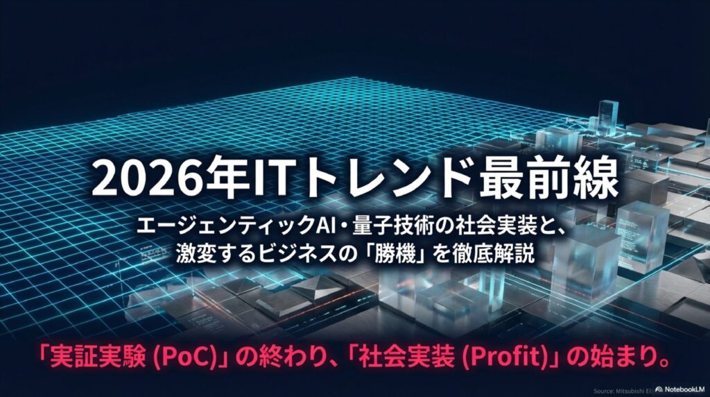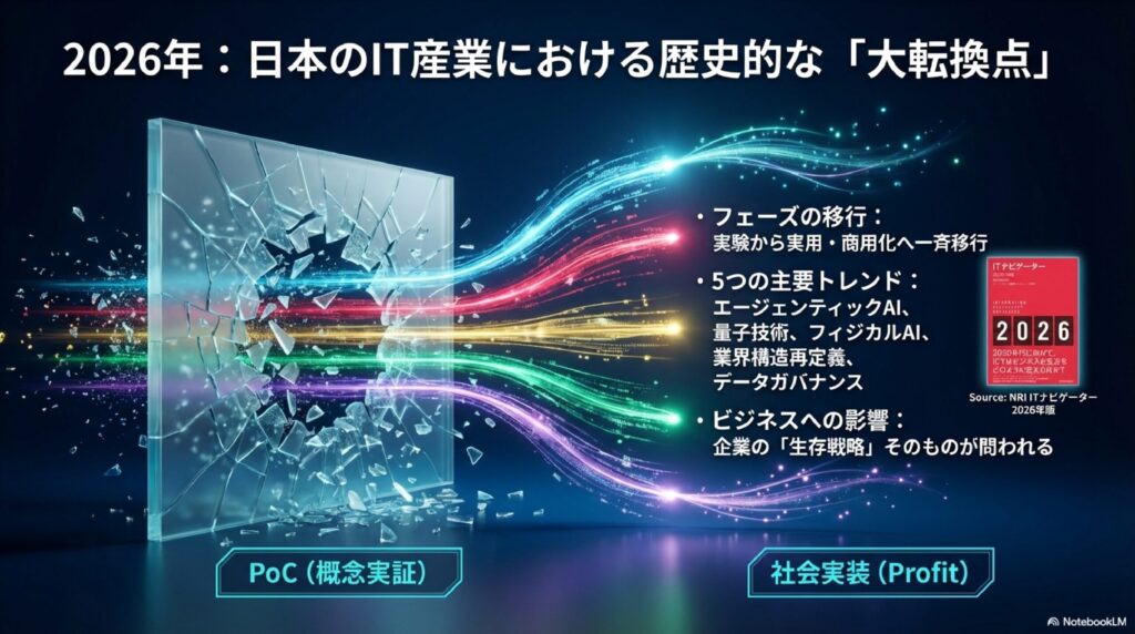 2026年は、日本のIT産業にとって歴史的な「大転換点」となります。これまで「実証実験(PoC)」の段階にあった先端技術が、いよいよ実用化・商用化のフェーズへと一斉に移行するためです。