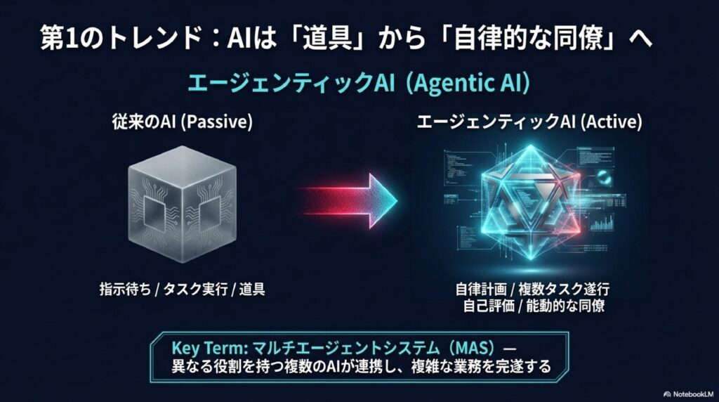 「エージェンティックAI」の台頭:AIは「道具」から「自律的な同僚」へ