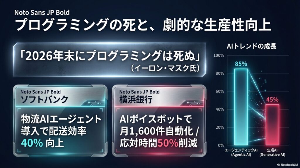 • プログラミングの変革: イーロン・マスク氏は「2026年末にプログラミングは死ぬ」と予言しました。人間がコードを書くのではなく、AIが直接バイナリコードを生成・自己改良する時代が到来しつつあります。