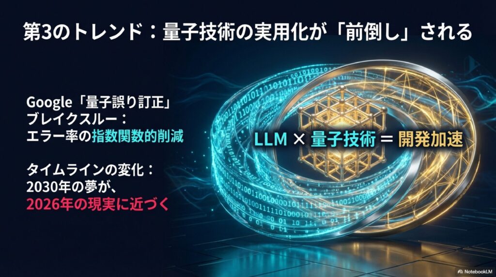 Googleが「量子誤り訂正」に大きな一歩を踏み出したことで、これまで2030年頃とされていた実用化が加速しています。LLMが量子コンピューターの研究開発における非構造化データの処理を効率化することも、この進化を後押ししています。