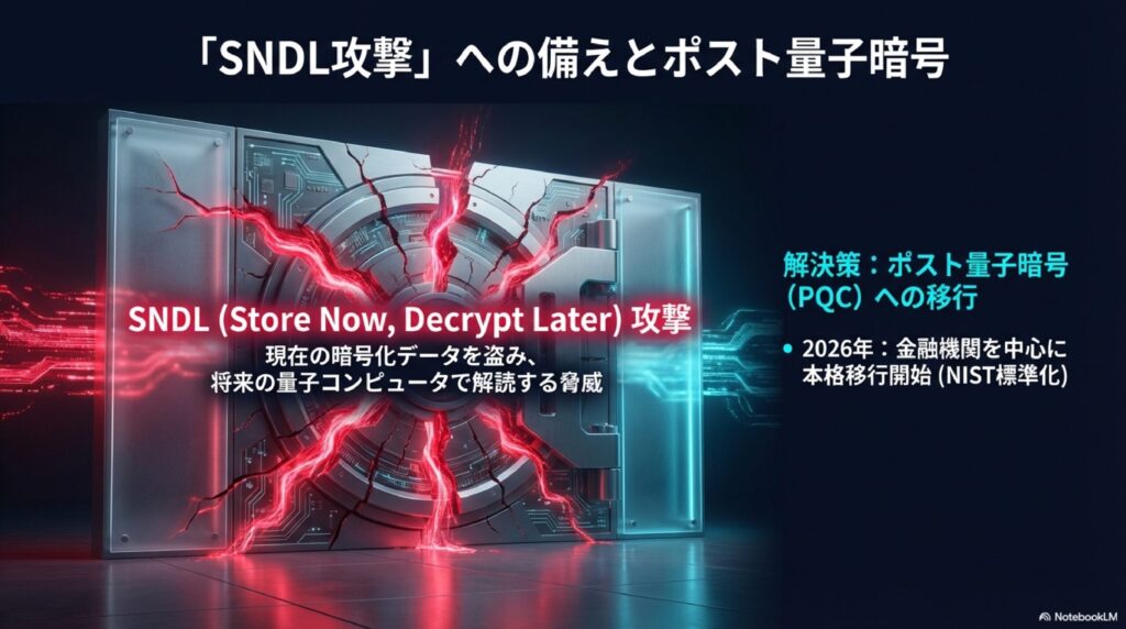 • SNDL(Store Now, Decrypt Later)攻撃: 今暗号化されたデータを盗んでおき、将来量子コンピューターで解読するサイバー攻撃です。