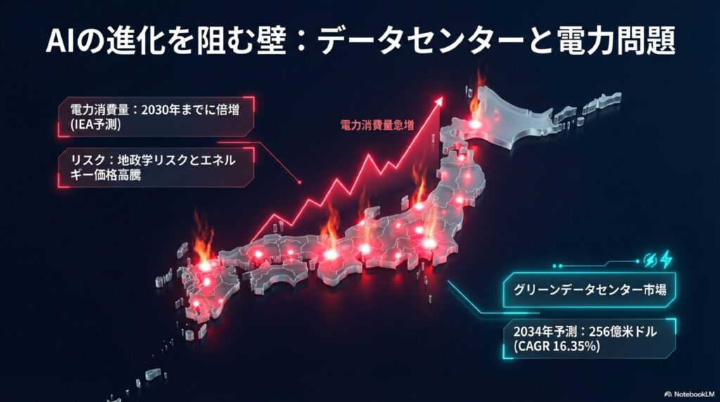 • 地政学リスク: 石油・天然ガスの輸入依存度が高い日本において、エネルギー価格の高騰はDC運営コストの上昇、ひいてはAIサービスの価格転嫁に直結する恐れがあります。