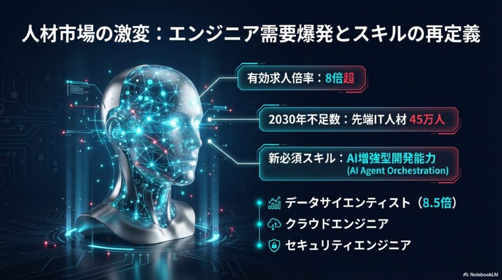 • 深刻な人材不足: 2030年には先端IT人材が45万人不足するとの試算もあります。