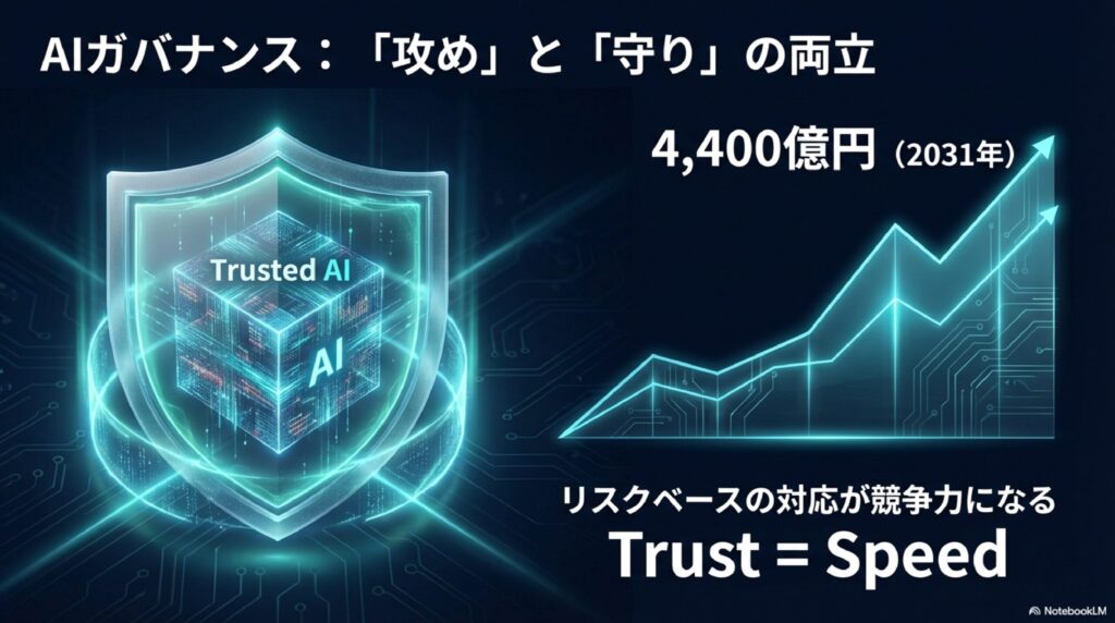 • AIガバナンス市場の拡大: ガバナンス体制構築のコンサルティングや管理ツールの需要が急増しており、2031年には国内で4,400億円規模に達する予測です。