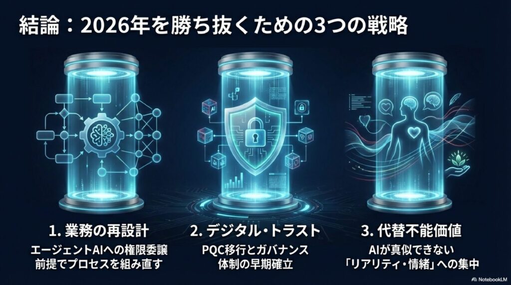 3. 付加価値への集中: AIに代替されにくい「リアリティ」や「情緒的価値」の創出にリソースを割く。